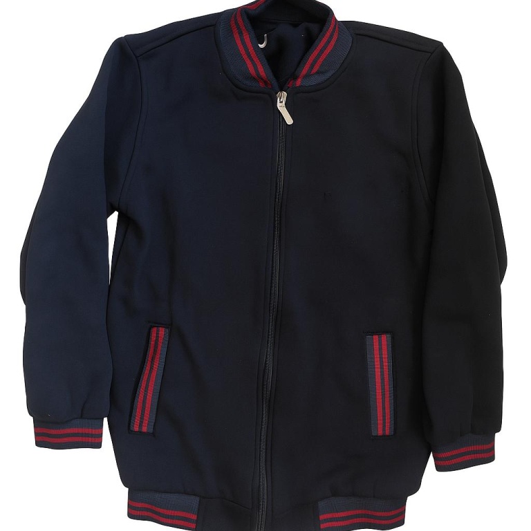 * Doğal ve sağlıklı kumaşlardan (pamuklu), lacivert renkli, fermuarlı ve kapüşonsuz ceket